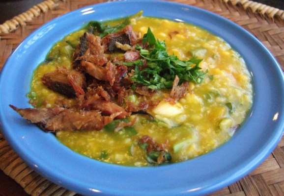 - Sajikan bubur manado selagi panas berama dengan sambal terasi dan ikan asin goreng.